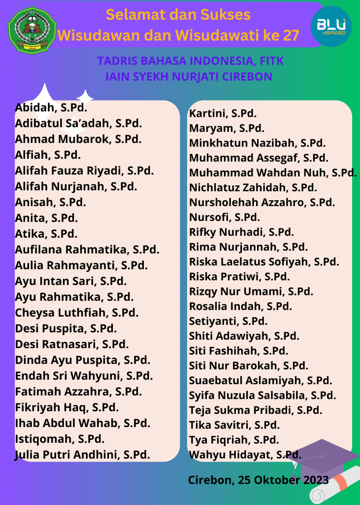 Rabu, 25 Oktober 2023 Selamat dan Sukses Wisuda ke-27 Mahasiswa Jurusan Tadris Bahasa Indonesia bertempat di Apita Hotel Cirebon, pelaksanaan